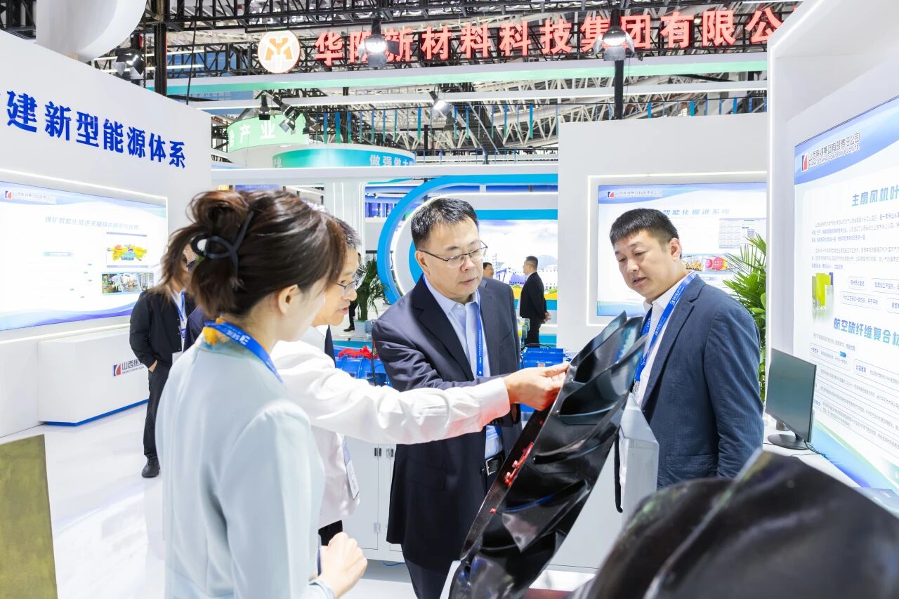 山西焦煤展厅通过企业宣传片、灯箱展板、实物装备、现场讲解等方式,全面展示了企业在井下智能绿色安全开采、绿色低碳发展、“数字化”应用和煤机装备制造等方面取得的丰硕成果。特别是霍州煤电亿能电气公司19人纯电动无轨胶轮车、1.9吨纯电动侧向驾驶无轨胶轮料车,机电公司安瑞风机主扇风机叶片、航空碳纤维复合材料叶轮、FCZ系列煤矿地面用抽出式轴流通风机及智能控制系统,以及运城盐化无机盐、日用洗涤剂等实物展品,吸引了众多参会者驻足参观、咨询交流。